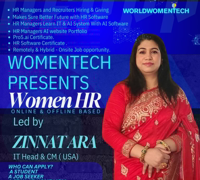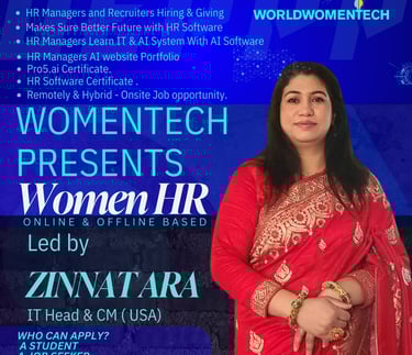 It looks like WomenTech is launching a Digital Entrepreneur Pilot Project Program focused on empowering women in HR and IT through AI and digital tools. This program, led by Zinnat Ara (IT Head & CM, USA), seems to provide training, certifications, and job opportunities in HR, IT, and AI fields.